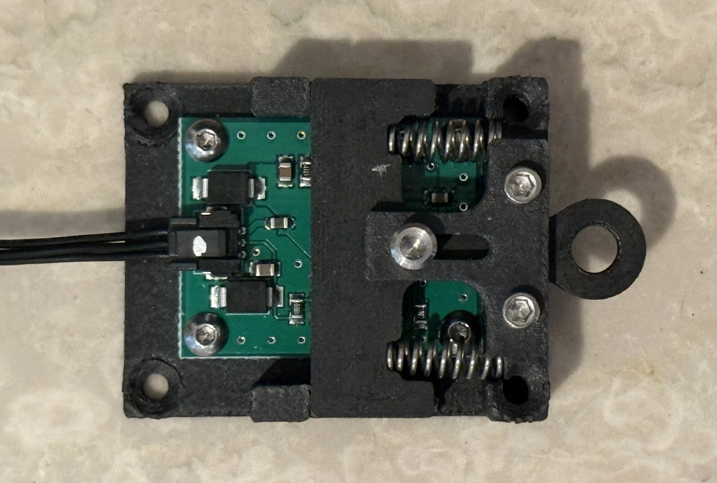 In the photo of the sensor assembly (currently 3D printed in-house using carbon fiber impregnated filament; eventually likely machined in metal), you can see: